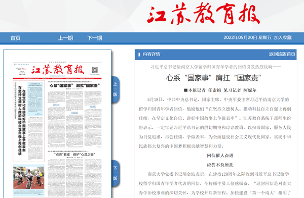 5月18日,中共中央总书记、国家主席、中央军委主席习近平给南京大学的留学归国青年学者回信,勉励他们“在坚持立德树人、推动科技自立自强上再创佳绩,在坚定文化自信、讲好中国故事上争做表率”。江苏教育系统干部师生纷纷表示,一定牢记习近平总书记的殷切期望和谆谆教诲,以报效国家、服务人民为自觉追求,再创佳绩,争做表率,为全面建设社会主义现代化国家、实现中华民族伟大复兴的中国梦积极贡献智慧和力量。