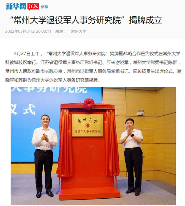 据悉,“常州大学退役军人事务研究院”旨在进一步加强对退役军人工作研究,全面推进新时代常州退役军人工作高质量发展,全力服务常州市“532”发展战略,助力校地融合发展走向新高度。