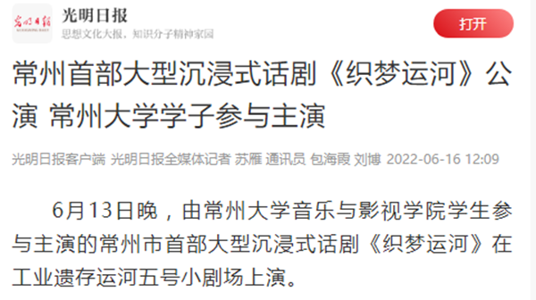 “本剧由我校8位学生参演主要角色,极大锻炼了学生的舞台表演能力。”音乐与影视学院院长熊祖鹏介绍,“学院将进一步挖掘常州本土文化,通过打造‘美育+社会实践’平台,陆续开展一批同人民生活、文化生活、精神生活相关的美育活动,为常州地方文化的发展贡献应有之力。”