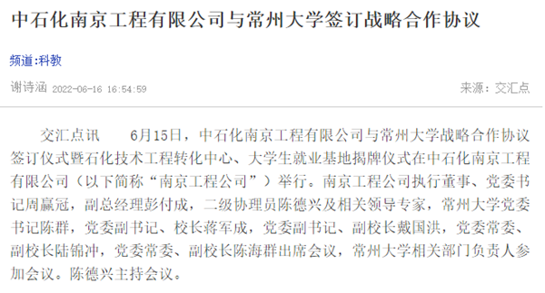 6月15日,中石化南京工程有限公司与常州大学战略合作协议签订仪式暨石化技术工程转化中心、大学生就业基地揭牌仪式在中石化南京工程有限公司(以下简称“南京工程公司”)举行。南京工程公司执行董事、党委书记周赢冠,副总经理彭付成,二级协理员陈德兴及相关领导专家,常州大学党委书记陈群,党委副书记、校长蒋军成,党委副书记、副校长戴国洪,党委常委、副校长陆锦冲,党委常委、副校长陈海群出席会议,常州大学相关部门负责人参加会议。陈德兴主持会议。