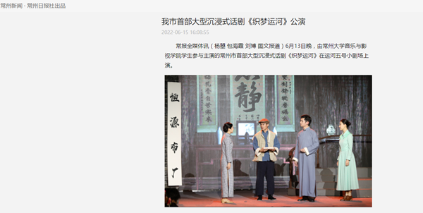 6月13日晚,由常州大学音乐与影视学院学生参与主演的常州市首部大型沉浸式话剧《织梦运河》在运河五号小剧场上演。