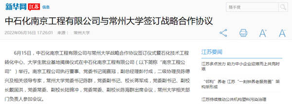 6月15日,中石化南京工程有限公司与常州大学战略合作协议签订仪式暨石化技术工程转化中心、大学生就业基地揭牌仪式在中石化南京工程有限公司(以下简称“南京工程公司”)举行。南京工程公司执行董事、党委书记周赢冠,副总经理彭付成,二级协理员陈德兴及相关领导专家,常州大学党委书记陈群,党委副书记、校长蒋军成,党委副书记、副校长戴国洪,党委常委、副校长陆锦冲,党委常委、副校长陈海群出席会议,常州大学相关部门负责人参加会议。