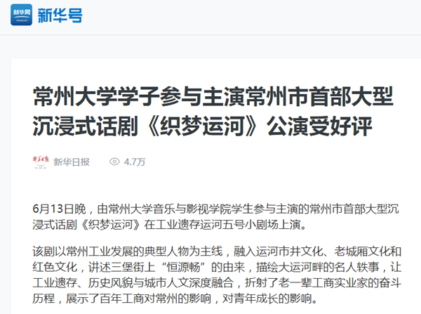 新华网:常州大学学子参与主演常州市首部大型沉浸式话剧《织梦运河》公演受好评