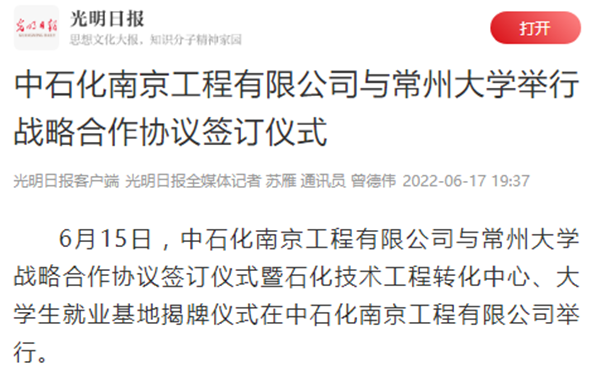 6月15日,中石化南京工程有限公司与常州大学战略合作协议签订仪式暨石化技术工程转化中心、大学生就业基地揭牌仪式在中石化南京工程有限公司举行。