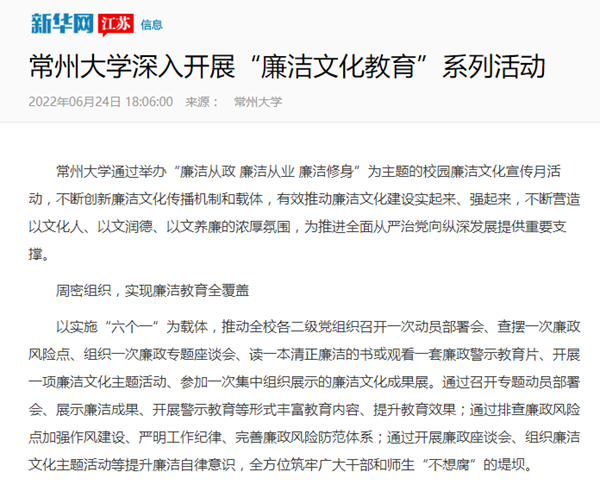 常州大学通过举办“廉洁从政 廉洁从业 廉洁修身”为主题的校园廉洁文化宣传月活动,不断创新廉洁文化传播机制和载体,有效推动廉洁文化建设实起来、强起来,不断营造以文化人、以文润德、以文养廉的浓厚氛围,为推进全面从严治党向纵深发展提供重要支撑。