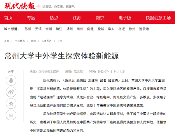 近日,常州大学中外大学生围绕“探索常州新能源,体验低碳新生活”的主题,深入溧阳地区新能源产业,以溧阳市政府提出的“电动溧阳”理念为线索,从龙头企业、绿色电网,到红色文旅产业,多维度,多视角了解当地新能源产业如何助力城乡发展,感受十年来美丽中国新农村的建设成果。