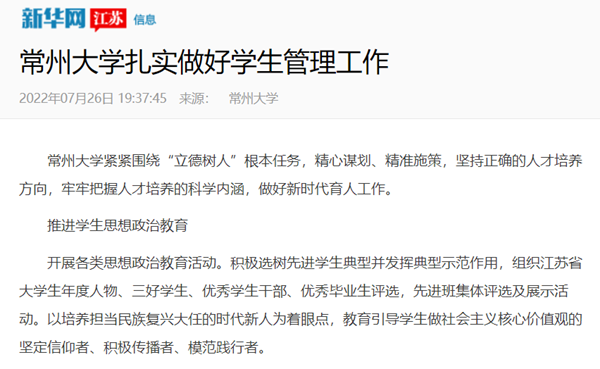 常州大学紧紧围绕“立德树人”根本任务,精心谋划、精准施策,坚持正确的人才培养方向,牢牢把握人才培养的科学内涵,做好新时代育人工作。