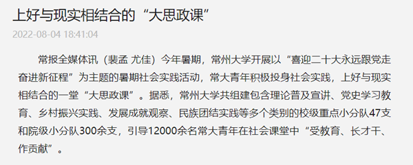 今年暑期,常州大学开展以“喜迎二十大永远跟党走奋进新征程”为主题的暑期社会实践活动,常大青年积极投身社会实践,上好与现实相结合的一堂“大思政课”。据悉,常州大学共组建包含理论普及宣讲、党史学习教育、乡村振兴实践、发展成就观察、民族团结实践等多个类别的校级重点小分队47支和院级小分队300余支,引导12000余名常大青年在社会课堂中“受教育、长才干、作贡献”。