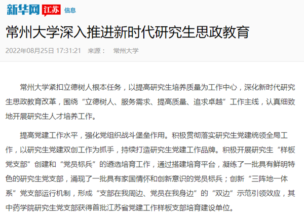 常州大学紧扣立德树人根本任务,以提高研究生培养质量为工作中心,深化新时代研究生思政教育改革,围绕“立德树人、服务需求、提高质量、追求卓越”工作主线,认真细致地开展研究生人才培养工作。