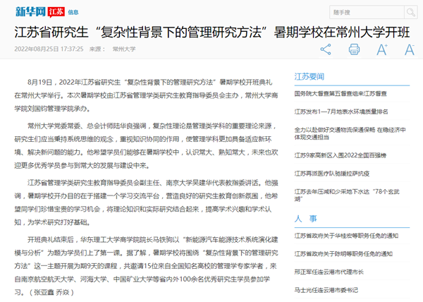 8月19日,2022年江苏省研究生“复杂性背景下的管理研究方法”暑期学校开班典礼在常州大学举行。本次暑期学校由江苏省管理学类研究生教育指导委员会主办,常州大学商学院刘国钧管理学院承办。