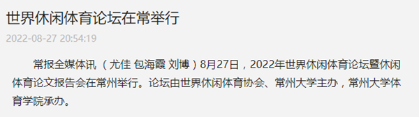 8月27日,2022年世界休闲体育论坛暨休闲体育论文报告会在常州举行。论坛由世界休闲体育协会、常州大学主办,常州大学体育学院承办。