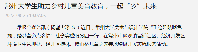 近日,常州大学美术与设计学院“手绘延陵曙色斓,踏梦留道点乡情”社会实践服务团一行,在常州市遥观镇留道社区、经济开发区环境卫生管理处、经开区横林、横山桥儿童之家等地积极开展志愿服务活动。