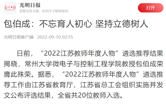 日前,“2022江苏教师年度人物”遴选推荐结果揭晓,常州大学微电子与控制工程学院教授包伯成荣膺此殊荣。据悉,“2022江苏教师年度人物”遴选推荐工作由江苏省教育厅、江苏省总工会组织实施并发文公布评选结果,全省共20位教师入选。
