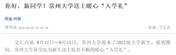 9月12日—9月15日,常州大学迎来了2022级大学新生。报到期间,常州大学各学院为新生送上惊喜不断的暖心“入学礼”。