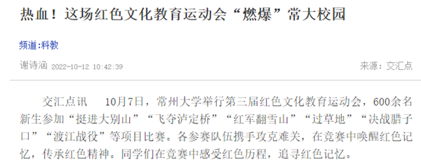 10月7日,常州大学举行第三届红色文化教育运动会,600余名新生参加“挺进大别山”“飞夺泸定桥”“红军翻雪山”“过草地”“决战腊子口”“渡江战役”等项目比赛。各参赛队伍携手攻克难关,在竞赛中唤醒红色记忆,传承红色精神。同学们在竞赛中感受红色历程,追寻红色记忆。