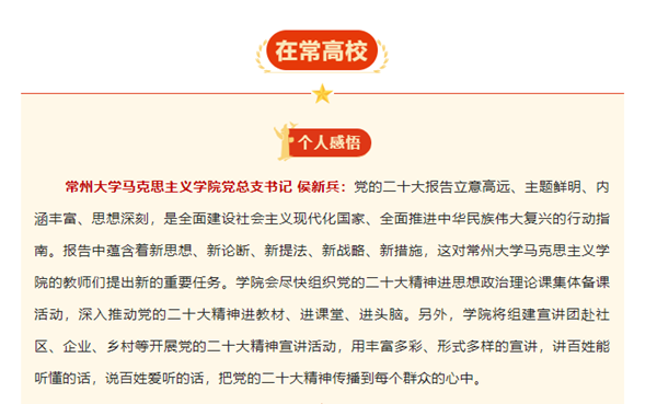 常州大学马克思主义学院党总支书记 侯新兵:党的二十大报告立意高远、主题鲜明、内涵丰富、思想深刻,是全面建设社会主义现代化国家、全面推进中华民族伟大复兴的行动指南。报告中蕴含着新思想、新论断、新提法、新战略、新措施,这对常州大学马克思主义学院的教师们提出新的重要任务。学院会尽快组织党的二十大精神进思想政治理论课集体备课活动,深入推动党的二十大精神进教材、进课堂、进头脑。另外,学院将组建宣讲团赴社区、企业、乡村等开展党的二十大精神宣讲活动,用丰富多彩、形式多样的宣讲,讲百姓能听懂的话,说百姓爱听的话,把党的二十大精神传播到每个群众的心中。