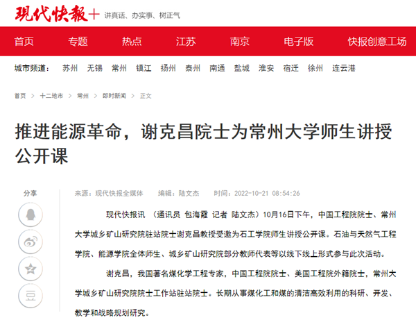10月16日下午,中国工程院院士、常州大学城乡矿山研究院驻站院士谢克昌教授受邀为石工学院师生讲授公开课。石油与天然气工程学院、能源学院全体师生、城乡矿山研究院部分教师代表等以线下线上形式参与此次活动。