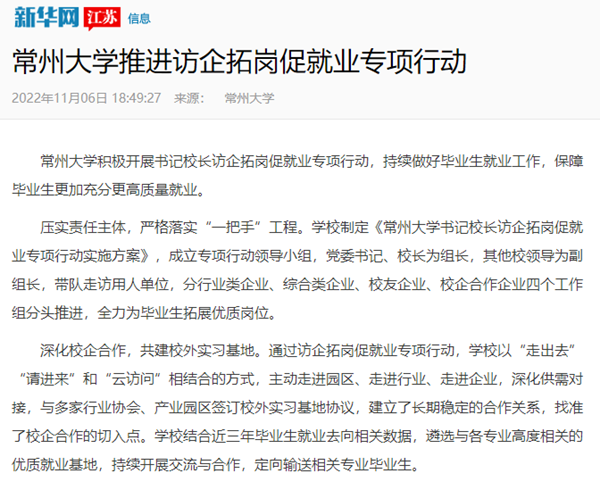 常州大学积极开展书记校长访企拓岗促就业专项行动,持续做好毕业生就业工作,保障毕业生更加充分更高质量就业。
