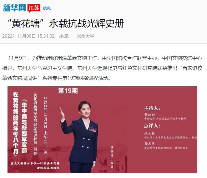 本期邀请了黄花塘新四军军部纪念馆讲解员秦菁担任讲述人,浙江理工大学马克思主义学院原院长、红色文化研究院院长、教授渠长根与茅山新四军纪念馆馆长、副研究馆员孙志军担任点评嘉宾。来自全国馆校合作联盟理事单位的常州大学、浙江理工大学、黄花塘新四军军部纪念馆、聊城职业技术学院等高校部分师生及博物馆人,通过线上的方式参加了此次活动。