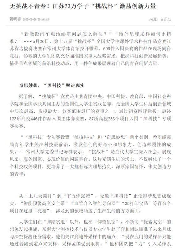 “新能源汽车电池续航问题怎么解决?”“地外星球采样如何更精准?”……5月26日,第十八届“挑战杯”全国大学生课外学术科技作品竞赛江苏省选拔赛决赛在常州大学体育馆拉开帷幕。699件入围决赛的作品在现场同台竞技,参赛的大学生团队充分瞄准国家重大战略需求,把握科技创新发展趋势,捕捉重点领域的前沿科技动态,用一件件成果展现着自己的青春创新力量。