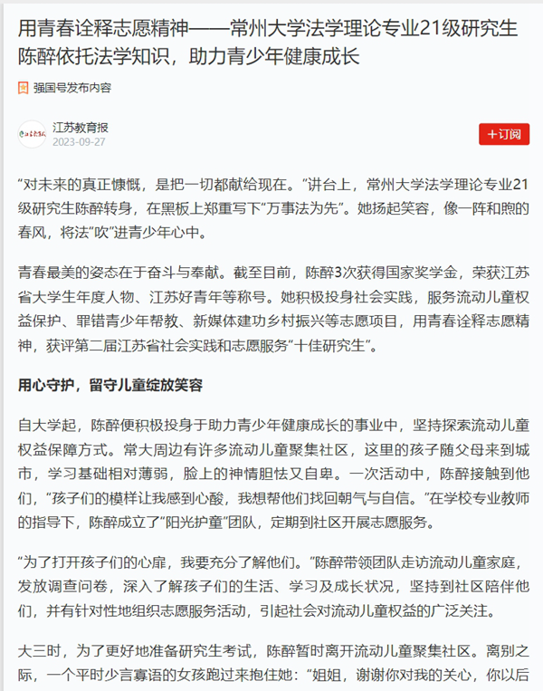 青春最美的姿态在于奋斗与奉献。截至目前,陈醉3次获得国家奖学金,荣获江苏省大学生年度人物、江苏好青年等称号。她积极投身社会实践,服务流动儿童权益保护、罪错青少年帮教、新媒体建功乡村振兴等志愿项目,用青春诠释志愿精神,获评第二届江苏省社会实践和志愿服务“十佳研究生”。