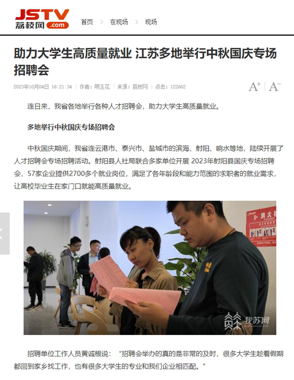 中秋国庆期间,我省连云港市、泰兴市、盐城市的滨海、射阳、响水等地,陆续开展了人才招聘会专场招聘活动。射阳县人社局联合多家单位开展 2023年射阳县国庆专场招聘会,57家企业提供2700多个就业岗位,满足了各年龄段和能力范围的求职者的就业需求,让高校毕业生在家门口就能高质量就业。