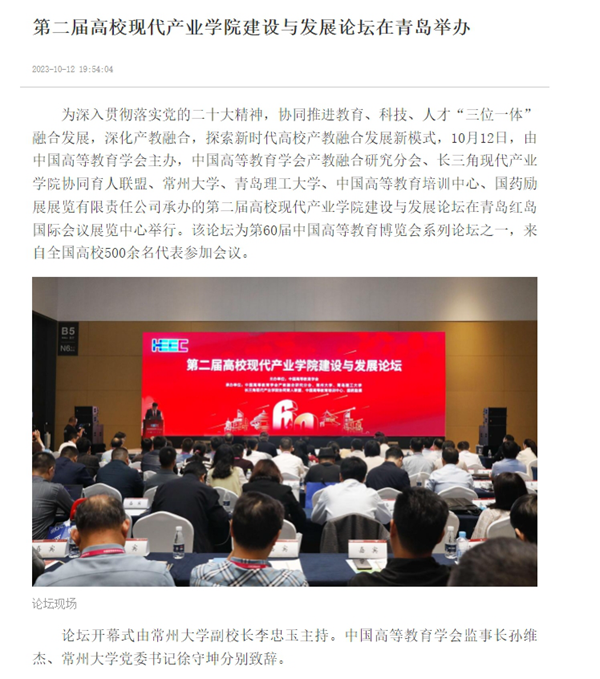 为深入贯彻落实党的二十大精神,协同推进教育、科技、人才“三位一体”融合发展,深化产教融合,探索新时代高校产教融合发展新模式,10月12日,由中国高等教育学会主办,中国高等教育学会产教融合研究分会、长三角现代产业学院协同育人联盟、常州大学、青岛理工大学、中国高等教育培训中心、国药励展展览有限责任公司承办的第二届高校现代产业学院建设与发展论坛在青岛红岛国际会议展览中心举行。该论坛为第60届中国高等教育博览会系列论坛之一,来自全国高校500余名代表参加会议。
