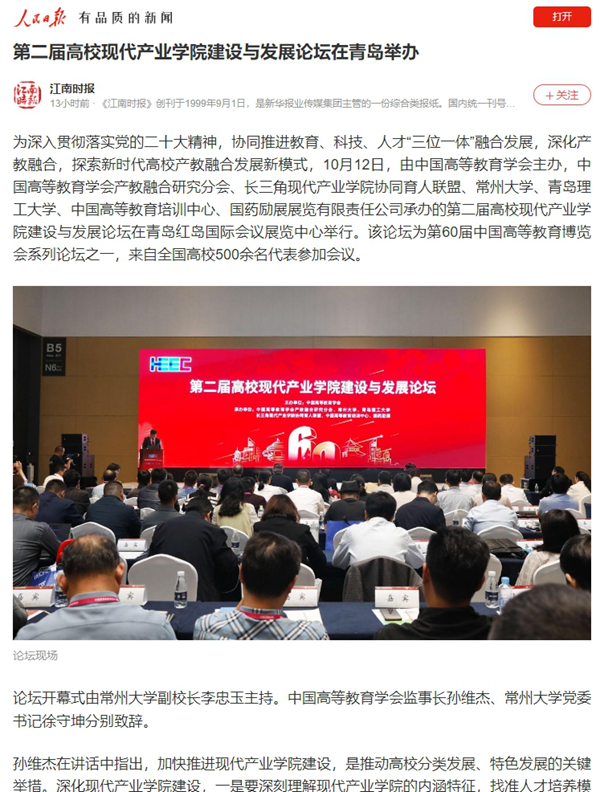 为深入贯彻落实党的二十大精神,协同推进教育、科技、人才“三位一体”融合发展,深化产教融合,探索新时代高校产教融合发展新模式,10月12日,由中国高等教育学会主办,中国高等教育学会产教融合研究分会、长三角现代产业学院协同育人联盟、常州大学、青岛理工大学、中国高等教育培训中心、国药励展展览有限责任公司承办的第二届高校现代产业学院建设与发展论坛在青岛红岛国际会议展览中心举行。该论坛为第60届中国高等教育博览会系列论坛之一,来自全国高校500余名代表参加会议。