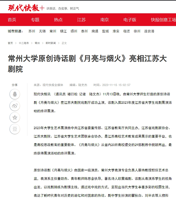 11月13日晚,由常州大学师生打造的原创诗话剧《月亮与烟火》在江苏大剧院戏剧厅成功上演,该剧入围2023年度江苏省大学生戏剧展演活动的终评展演。