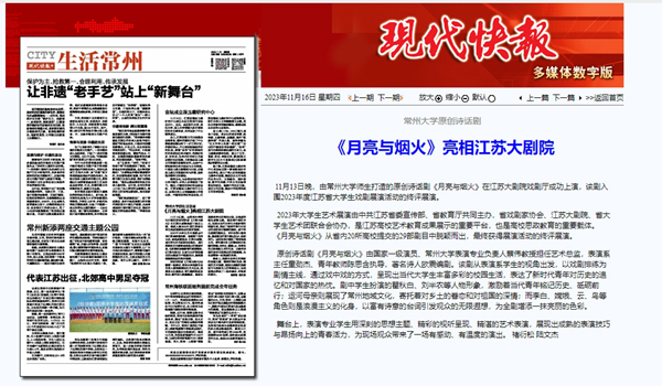11月13日晚,由常州大学师生打造的原创诗话剧《月亮与烟火》在江苏大剧院戏剧厅成功上演,该剧入围2023年度江苏省大学生戏剧展演活动的终评展演。