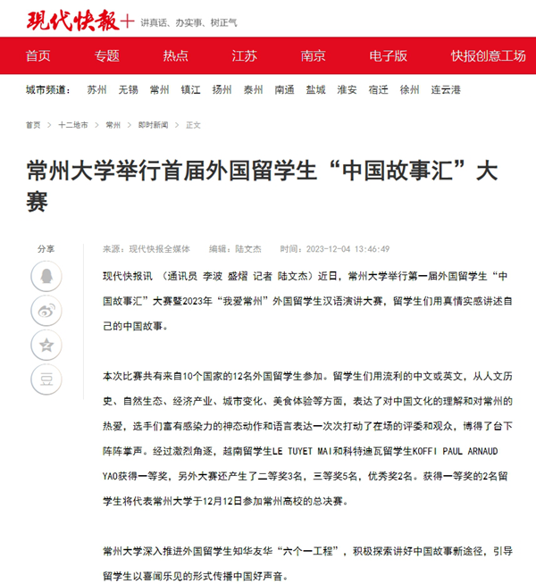 近日,常州大学举行第一届外国留学生“中国故事汇”大赛暨2023年“我爱常州”外国留学生汉语演讲大赛,留学生们用真情实感讲述自己的中国故事。