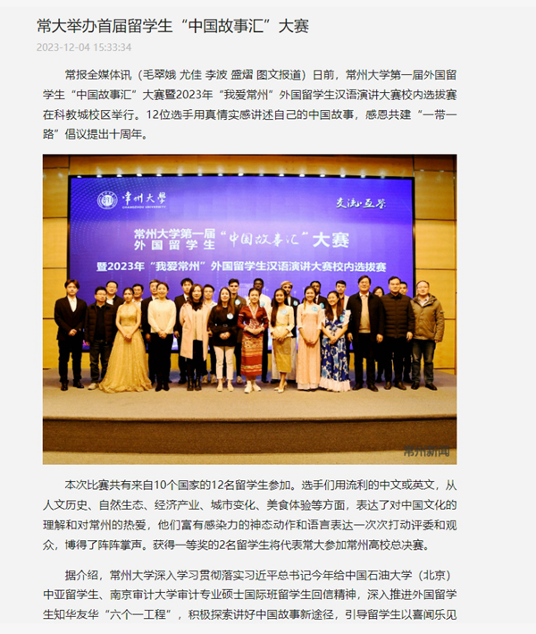 日前,常州大学第一届外国留学生“中国故事汇”大赛暨2023年“我爱常州”外国留学生汉语演讲大赛校内选拔赛在科教城校区举行。12位选手用真情实感讲述自己的中国故事,感恩共建“一带一路”倡议提出十周年。
