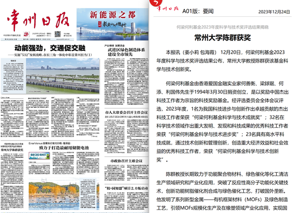 12月20日,何梁何利基金2023年度科学与技术奖评选结果公布,常州大学教授陈群获该基金科学与技术创新奖。