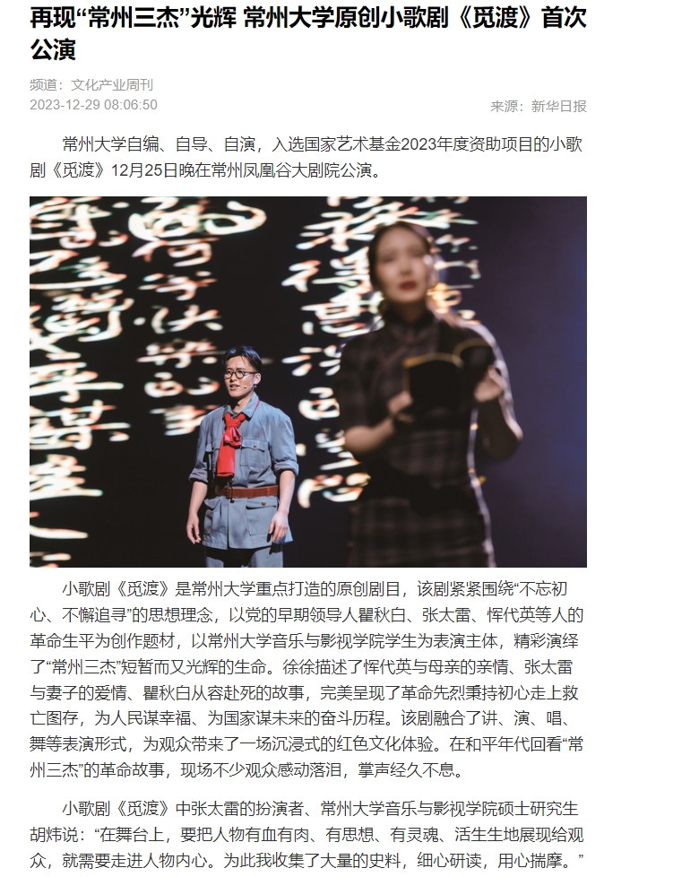 常州大学自编、自导、自演,入选国家艺术基金2023年度资助项目的小歌剧《觅渡》12月25日晚在常州凤凰谷大剧院公演。