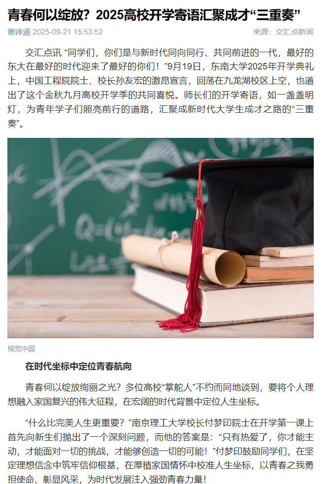 “同学们,你们是与新时代同向同行、共同前进的一代,最好的东大在最好的时代迎来了最好的你们!”9月19日,东南大学2025年开学典礼上,中国工程院院士、校长孙友宏的激昂宣言,回荡在九龙湖校区上空,也道出了这个金秋九月高校开学季的共同喜悦。师长们的开学寄语,如一盏盏明灯,为青年学子们照亮前行的道路,汇聚成新时代大学生成才之路的“三重奏”。