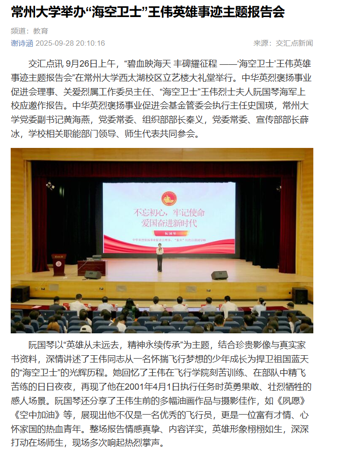 9月26日上午,“碧血映海天 丰碑耀征程 ——‘海空卫士’王伟英雄事迹主题报告会”在常州大学西太湖校区立艺楼大礼堂举行。中华英烈褒扬事业促进会理事、关爱烈属工作委员主任、“海空卫士”王伟烈士夫人阮国琴海军上校应邀作报告。中华英烈褒扬事业促进会基金管委会执行主任史国瑛,常州大学党委副书记黄海燕,党委常委、组织部部长秦义,党委常委、宣传部部长薛冰,学校相关职能部门领导、师生代表共同参会。