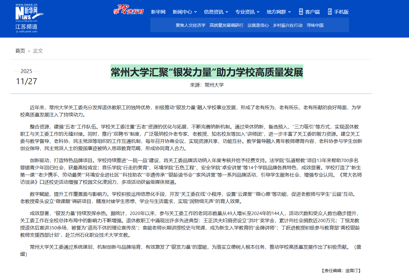 常州大学关工委通过系统谋划、机制创新与品牌培育,有效激发了“银发力量”的潜能,为落实立德树人根本任务、推动学校高质量发展作出了积极贡献。