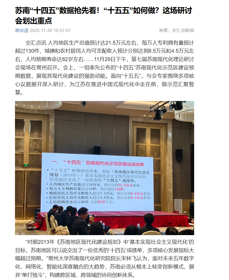 人均地区生产总值预计达21.5万元左右,每万人专利拥有量预计超过130件,城镇和农村居民人均可支配收入预计分别达到8.5万元和4.5万元左右,人均预期寿命达82岁左右……11月29日下午,第七届苏南现代化理论研讨会现场在常州召开。会上,一组率先公布的“十四五”苏南现代化示范区建设预期数据,展现其现代化建设的强劲动能。面向“十五五”,与会专家围绕多项核心议题展开深入研讨,为江苏在推进中国式现代化中走在前、做示范汇聚智慧。