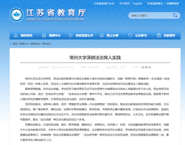 常州大学立足办学特色,将法治宣传教育作为落实立德树人根本任务的关键抓手,构建“思想引领—课堂教学—文化浸润—校地协同”四位一体育人体系,在法治人才培养与社会普法服务中成果丰硕,为法治校园和地方法治建设注入强劲动能。