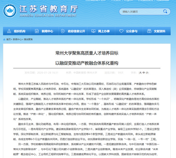 常州大学是江苏省人民政府与中石油、中石化、中海油三大石油公司共建高校,石油石化行业底蕴深厚、产教融合办学特色鲜明。学校深度聚焦高质量人才培养目标,系统凝练“以融促变”的改革理念,深入推进校(政)企深度融合,持续强化产业深度赋能,系统实施组织载体、培养过程、协同机制的产教一体化改革,形成了适应产业创新发展需要的高质量人才培养体系。