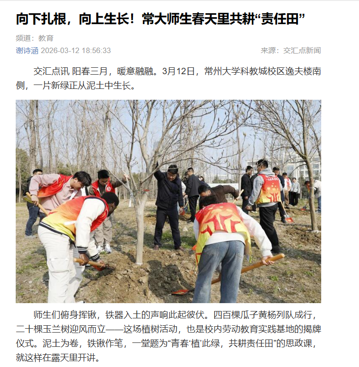 坑要深,土要实——植树要领说起来简单,可当铁锹真正切入泥土,师生们才懂得,那些关于“责任”的训导,原来就藏在这看似朴素的劳作里。根向下扎得越深,树向上长得越稳——常州大学的校训“责任”,在这一锹一铲间变得可触可感。玉兰是常州市树,二十棵玉兰在这里扎根,象征着学校融入和服务地方的坚定决心。