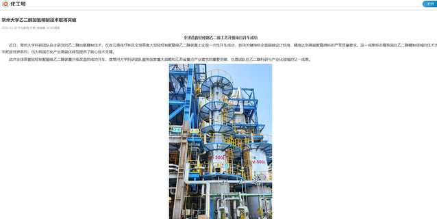 近日,常州大学科研团队自主研发的乙二醇加氢精制技术,在连云港(4.990, 0.01, 0.20%)徐圩新区全球首套大型轻烃制聚酯级乙二醇装置上实现一次性开车成功,各项关键指标全面超越设计标准,精准达到高端聚酯原料的严苛质量要求。这一成果标志着我国在乙二醇精制领域的技术水平跃居世界前列,也为我国石化产业高端化转型提供了核心技术支撑。