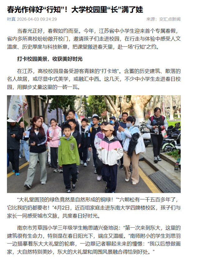 当春光正好,春假如约而至。今年,江苏省中小学生迎来首个专属春假,省内多所高校纷纷敞开校门,邀请孩子们走进校园,在行走与体验中感受人文温度、历史厚度与科技新意,把课堂搬进春天里,赴一场“行知”之约。
