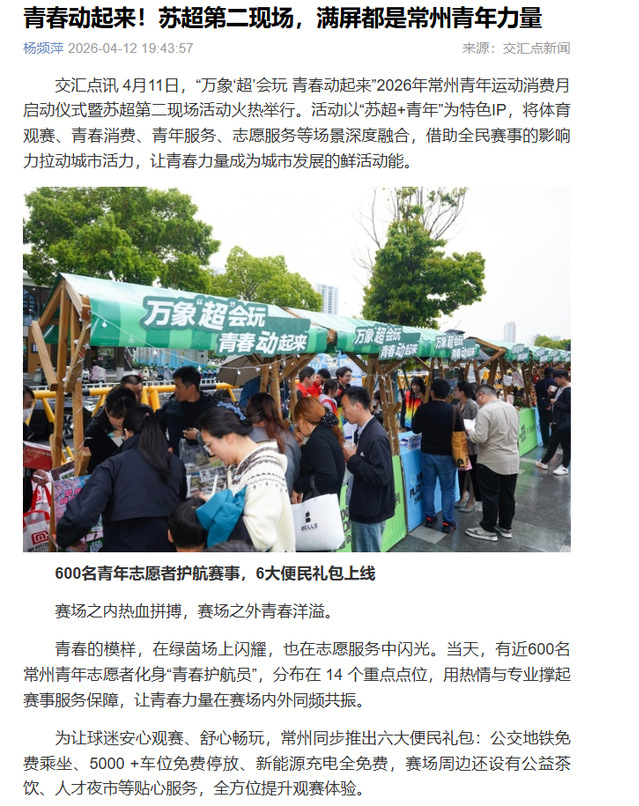 青春赋能不止步。据了解,团省委将以此次活动为契机,持续做强“苏超+青年”品牌,深化青年志愿服务、青年创业就业、婚恋交友、乡村振兴与赛事经济、文旅消费的深度融合,不断拓展青年场景、优化青年服务、激活青年活力,全力打造更具影响力的城市足球联赛标杆,以青春之力赋能文旅体商高质量发展,为“强富美高”新江苏现代化建设注入源源不断的青春动能。